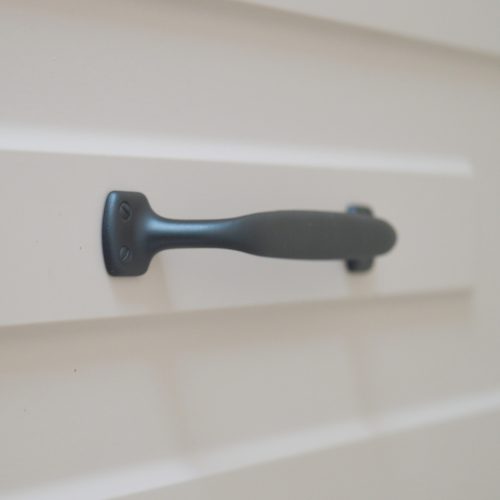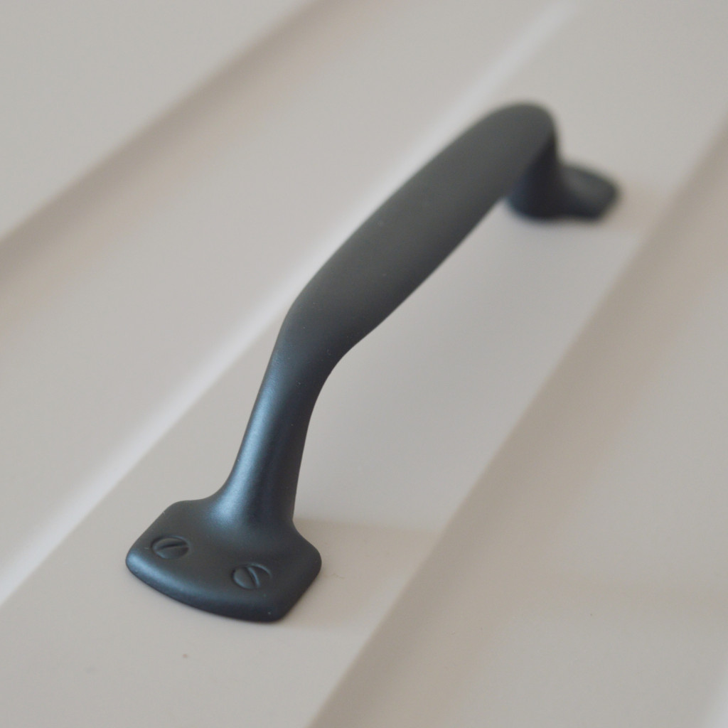 Matt fekete színű, fém bútorfogantyú. Vidéki stílusú szekrények, konyha-, előszoba bútorok kiegészítőjeként tökéletesen beleillő bútorfogantyú.