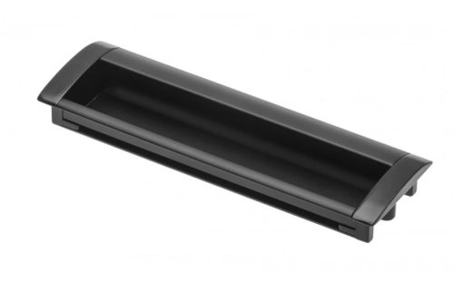 Matt fekete színű, besüllyeszthető fém bútorfogantyú, mely szekrények, eltolható ajtók kiegészítőjeként tökéletesen beleillik egy otthoni környezetbe.