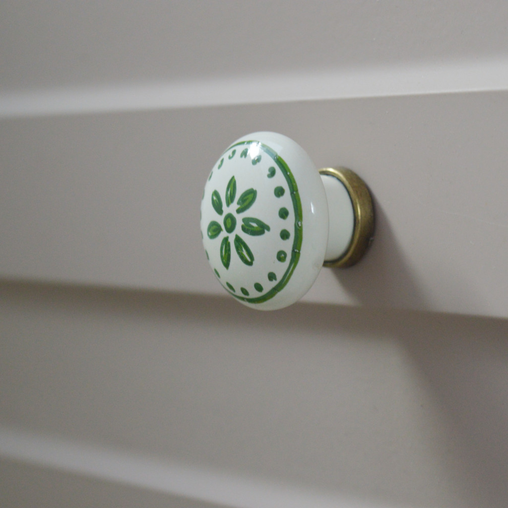 Fém-porcelán bútorgomb, bézs - bronz színű talprésszel, zöld virág mintával