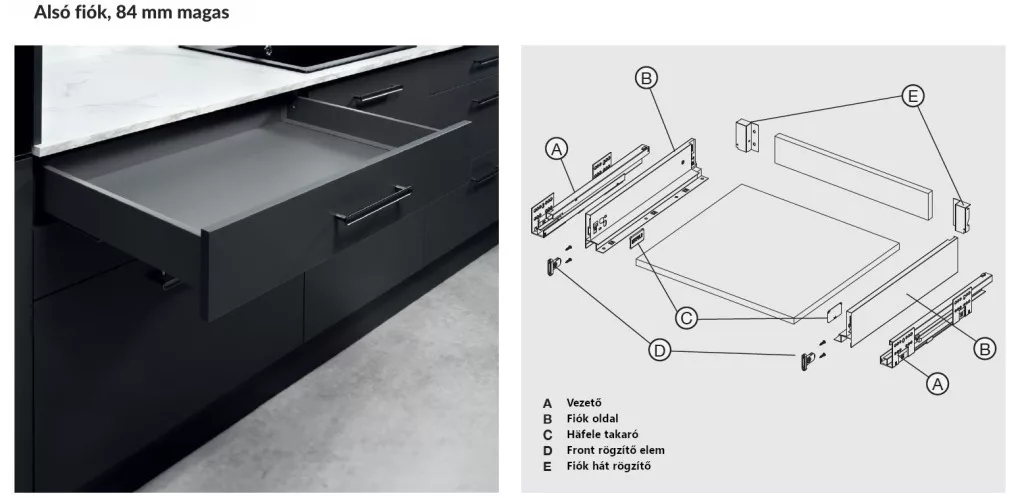 Teljes kihúzású, önbehúzós rendszerrel. 16 mm bútorlap szükséges az összeállításhoz