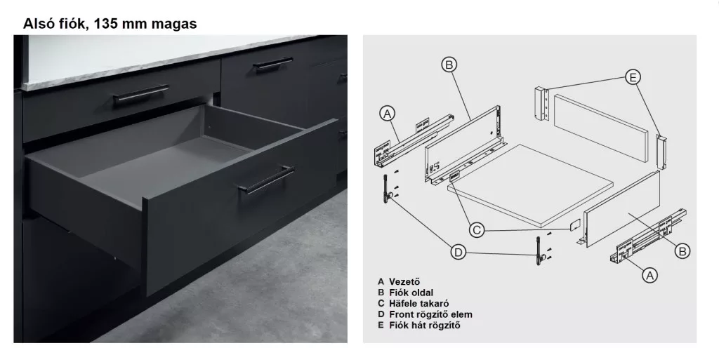 Teljes kihúzású, önbehúzós rendszerrel. 16 mm bútorlap szükséges az összeállításhoz